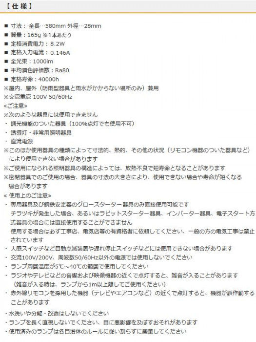 直管蛍光ランプ20形相当の明るさ。光色は昼光色で2本入りです。