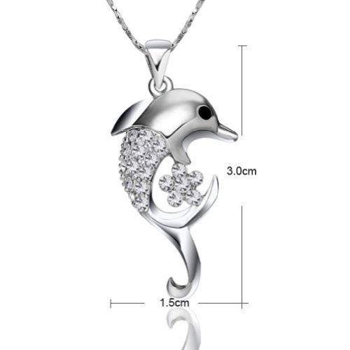 - Feature : The cute dolphin pendant with a flower covered with clear Austrian crystals shinning beautifully. Three layers of 18k white gold plated, nickel free and tarnish free. / A perfect fashion accessory to complement your wardrobe or as an appropriate gift used in wedding and engagement party or other occasions. / The chain is about 15.7'' long. The pendant size -is 0.6''*1.2''. / Shipped out in an exquisite jewelry gift box. Delivery time 7-15 days. / One year warranty to ensure you a perfect shopping experience.