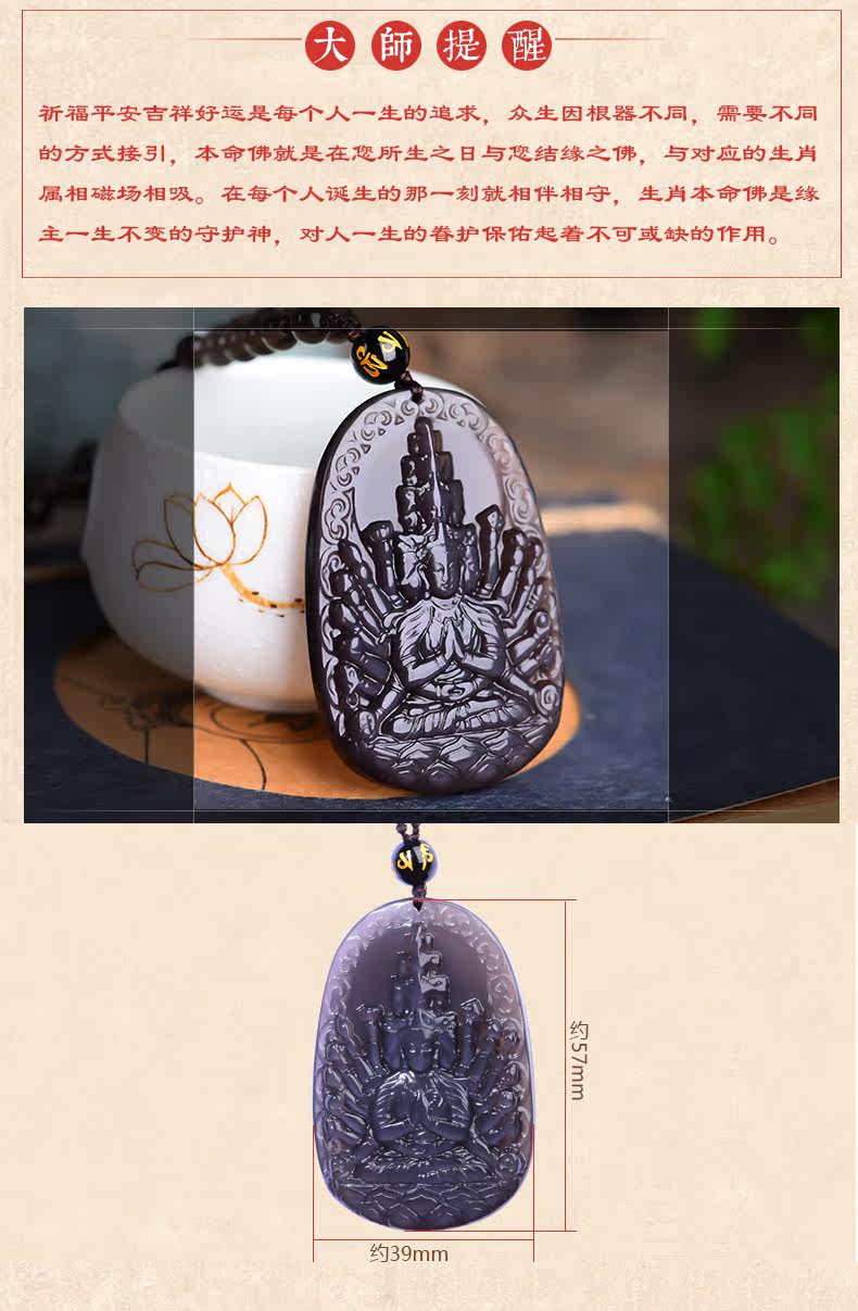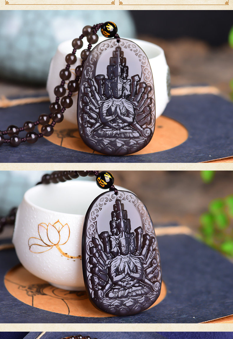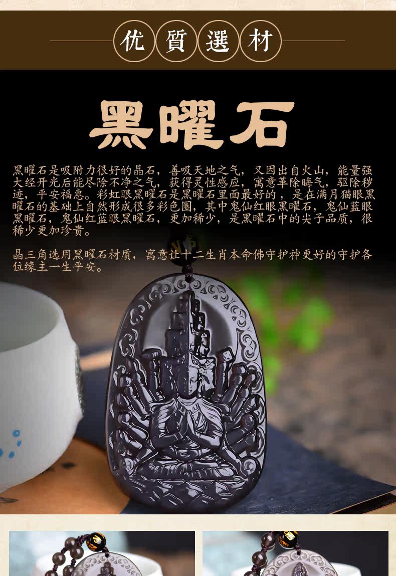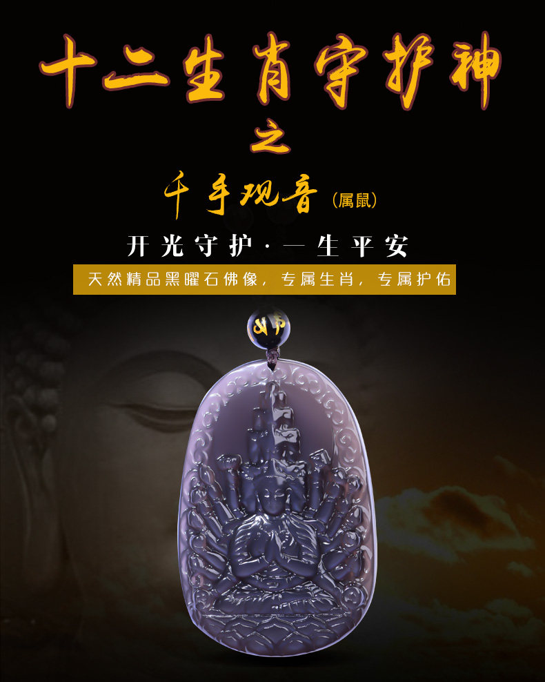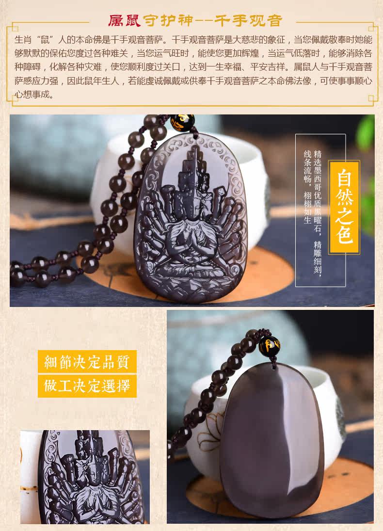 开光天然彩虹眼黑曜石千手观音菩萨吊坠 生肖鼠守护神本命佛项链