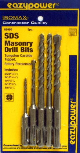 -. Binding : Tools & Home Improvement -. Brand : Eazypower -. EAN : 0083771889906 -. Feature : 5-piece SDS masonry drill set includes sizes 5/32, 3/16, 1/4, 5/16 and 3/8 inch diameters / For use in all SDS hammer drills / Tungsten carbide tipped / Designed to eliminate drill slippage / Handy plastic storage case -. Label : Eazy Power -. Manufacturer : Eazy Power -. Model : 88990 -. MPN : 88990 -. PartNumber : 88990 -. ProductGroup : Home Improvement -. ProductTypeName : TOOLS -. Publisher : Eazy Power -. Studio : Eazy Power -. Title : Eazypower 88990 5-Piece 5/32-Inch-3/8 -Inch SDS Plus Drill Bit Set -. UPC : 083771889906 -. Warranty : Guaranteed against defects in materials or workmanship. Accessories are consumable and will wear with extended use.