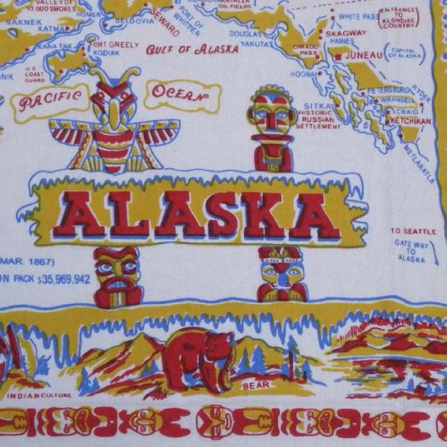 - Genuine flour sack kitchen dish towels printed with the features of the state of Alaska.