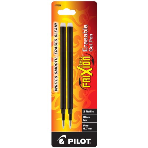 -. Binding : Office Product -. Brand : Pilot -. Color : Black -. EAN : 0072838773203 -. Feature : Made to fit Pilot FriXion Ball, FriXion Clicker and FriXion LX pens / Fine point (0.7mm) / 2 premium erasable black gel ink refills per pack / Unique Thermo-Sensitive Gel Ink formula disappears with erasing friction / Extend the life of your favorite Pilot FriXion Erasable pen -. Label : Pilot Pen Corporation of America -. Manufacturer : Pilot Pen Corporation of America -. Model : 77320 -. MPN : 77320 -. NumberOfItems : 1 -. PackageQuantity : 1 -. PartNumber : 77320 -. ProductGroup : Office Product -. ProductTypeName : WRITING_INSTRUMENT -. PublicationDate : 2012-11-15 -. Publisher : Pilot Pen Corporation of America -. Size : 2-Pack (Fine Point) -. Studio : Pilot Pen Corporation of America -. Title : Pilot FriXion Gel Ink Pen Refill, 2-Pack for Erasable Pens, Fine Point, Black Ink (77320) -. UPC : 072838773203