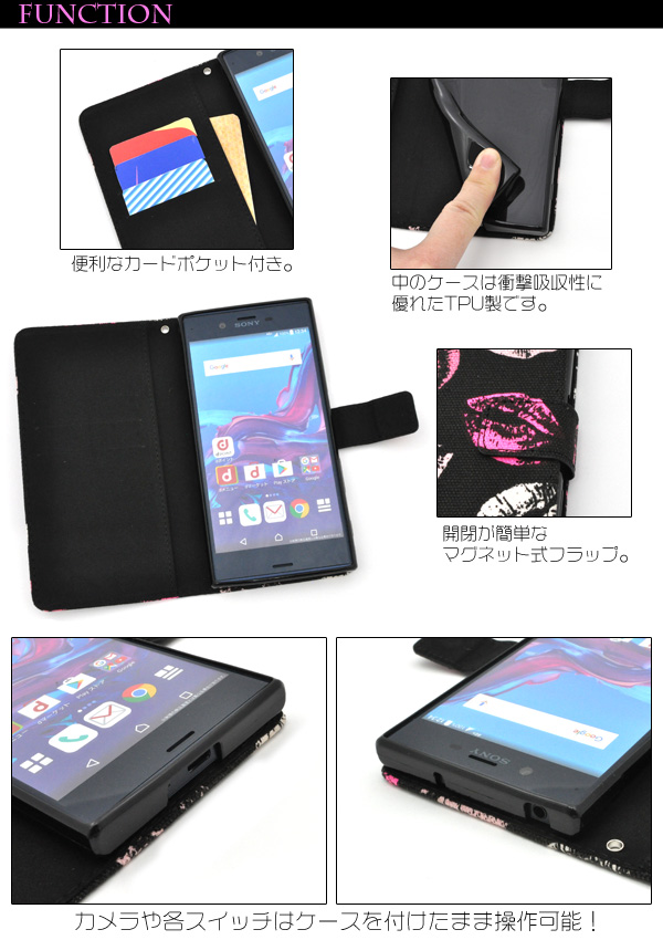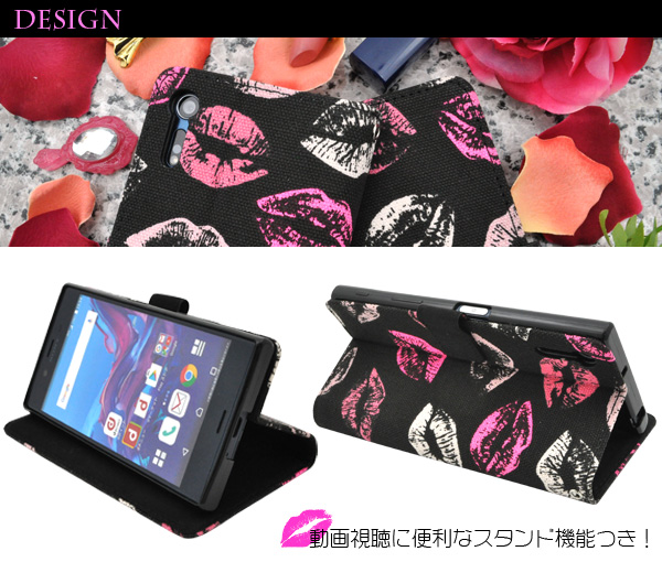 | 黒地に大胆にあしらわれたリップがおしゃれなケースです。 内側にカードポケットとサイドポケット付きでカードの収納に便利です! 開閉はマグネット式で、使い勝手の良い手帳型です。 衝撃やキズなどからXperia XZ (SO-01J/SOV34/601SO)を守るのはもちろん、 カメラ、イヤホンや各種ボタンなどをケースに入れたまま操作可能です。 ※Xperia XZ (SO-01J/SOV34/601SO)は付属しません。 ※ライセンス商品ではありません。 |