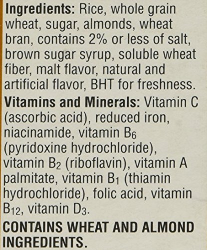 -. Feature : Made with Whole Grains / Good source of Fiber / Crunchy rice and whole grain wheat flakes are sprinkled with roasted almonds and a touch of honey and vanilla