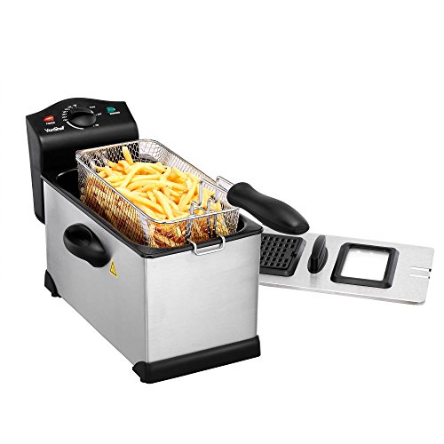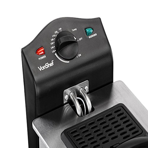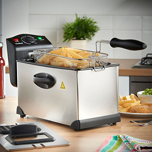 Forget the fish and chip shop and make your own at home with the VonShef Deep Fryer with basket.The Deep Fat Fryer opens up an exciting world of culinary possibilities - stick to fail safe fish and chips or turn your hand to the many other recipes options such as deep fried doughnuts, fritters, chocolate bars, popcorn chicken, spring rolls - the list is endless! Easy to use and thermostatically controlled - temperature can be set to between 250°F - 370°F to cook ingredients to the perfect crisp.