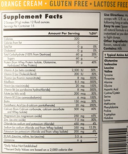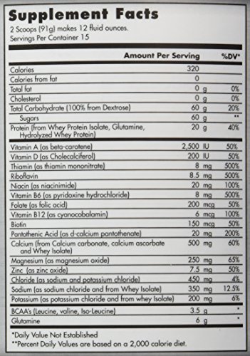 -. Feature : Serving Size: 2 scoops / Servings Per Container: 15 / Calories: 320 / Total Carbohydrates: 60 g / Total Fat: 0 g