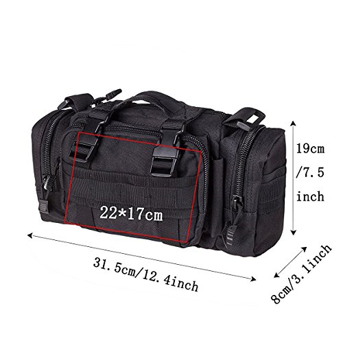 -. Feature : Made of High-density polyester fabric,light weight and durable.Zippers upgraded, Good Hardware / Upgraded version,MOLLE Pouch with 4 Zippered Compartments and Multiple pockets for Easy Organization of Gear,the main compartment size :9.8*7.5*3.1 inch / 4-Way Carry(Waist, Shoulder,Chest sling-back sling,Hand Carry) with Adjustable, Detachable Strap / Easy to carry ,Molle system pouchs can be attached freely / Great Indoor and Outdoor uses including Travel, Camping, Hiking, Hunting, Sports, School Supplies, Tools, Etc