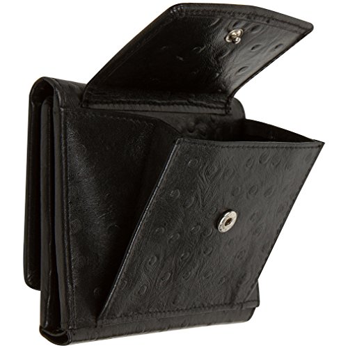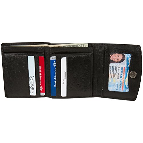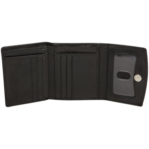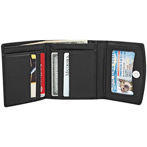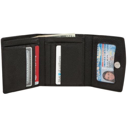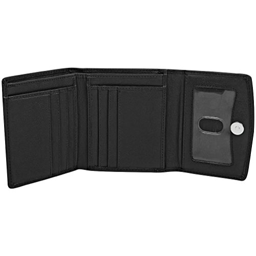 -. Feature : 8 credit card slots, ID Window, and coin compartment / Secure Magnetic snap closure, Currency pocket, and 2 slip pockets / Protect your Credit and Debit cards from Wireless RFID theft / Soft leather trifold, compact and fits easily in handbag or pocket / Dimensions: 4.5" x 3.8" x 1"