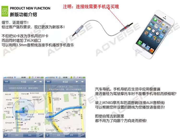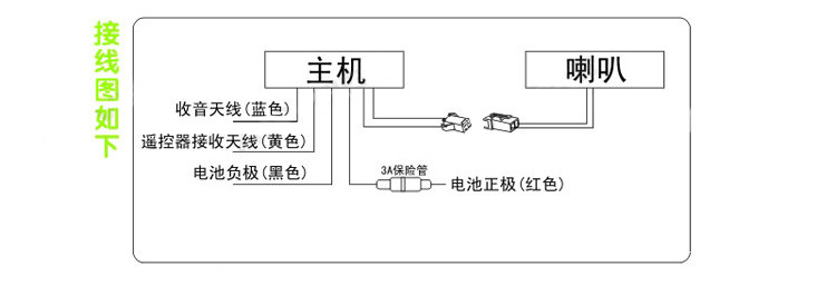 接线方法:粗红接12V电压正极,粗黑接12V电压负极,喇叭插件对插就好了,其余的是信号线,不用接。品名:奥维斯