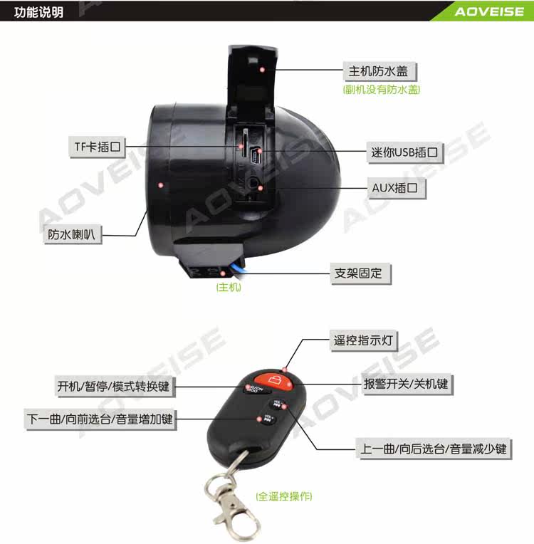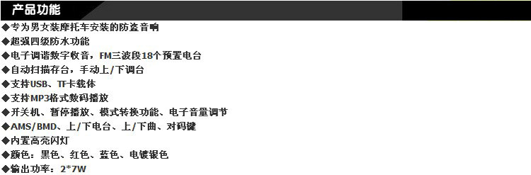 本机是全新一代数码产品,支持遥控器和防盗功能,MP3播放器可直接适用手机内存卡(TF卡),FM采用高品质数字收音模板,音质更清晰,本产品高保真立体声设计,带给你全新的聆听体验;便捷的多功能遥控器按键适用方便;具有循环播放和断电记忆功能。
