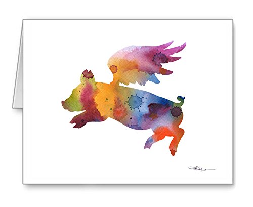 -. Feature : "When Pigs Fly" artwork by watercolor artist DJ Rogers. / Note card size is 4.25 x 5.5 inches / Matching white envelopes included. / Note cards are blank inside for your personal message. / Suitable for framing.