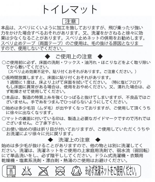 | 素材・材質 | トイレマット:アクリル100%(裏面:合成ゴム) フタカバー:アクリル100% |