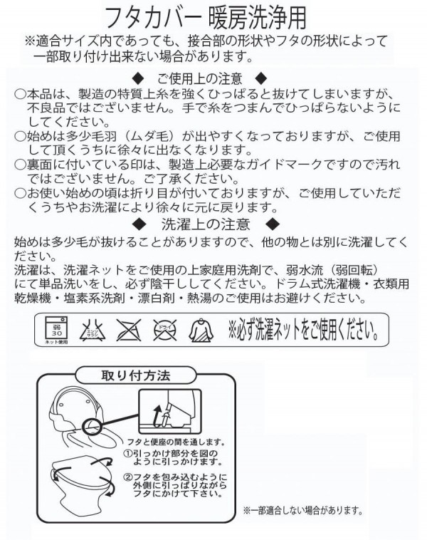 | 仕様 | トイレマット:約縦90×横60cm フタカバー(暖房洗浄用):約縦44×横38cm以下用 |