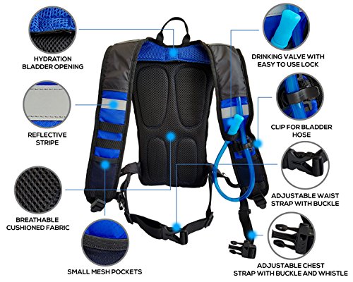 Imagine how great it would be, to be in the middle of your best hiking trip, riding your bicycle, running, mountain biking, or doing any of your favorite outdoor activities and being able to drink water without stopping? Whether you're a professional athlete or an amateur, we know you want and deserve the best, InvocaSport Hydration Backpack brings nothing less than that to you. Water Bladder-?The hydration backpack includes a BPA Free 2 litre water bladder with an extra wide opening allowing you to clean the reservoir easily and even fit ice inside so your water stays cool Storage Space- Has 2 large storage compartments and 1 small pocket on the outside of the bag that you're able to securely store cellphones, or any other items you may need. Style- This black and blue pack is ideal for men, women, and kids. It has adjustable arm, chest, and waist straps so you're always able to obtain the perfect fit. Comfort- Ultra lightweight bag with padded straps and breathable padded back makes this backpack exceptionally comfortable to wear while doing any activity. Extra features- Includes an emergency whistle and a mouthpiece that locks, making sure no water leaks. 100% satisfaction guarantee! Our hydration backpack is backed by our manufacturer 30 day money back guarantee with 1 year free replacement warranty Click on the add to cart, and stay hydrated while having fun! ? 0 |