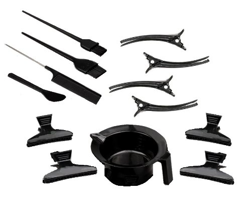 -. Feature : 14-piece hair dying styling kit - includes all necessary tools for styling and dying hair. / 4 long hair clips, 2 large hair clips, and 2 short hair clips / Four multi-use tools for styling: comb, brush, and picking options / Graduated mixing bowl with pour spout and handle / New Kit packaged in a zippered, reusable waterproof travel bag