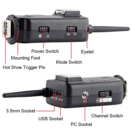4.Uses global free FSK 2.4GHz and is compatible with high voltage flashgun and studio flashes, uses 2 standard AA batteries and also the USB socket for power supply.