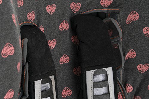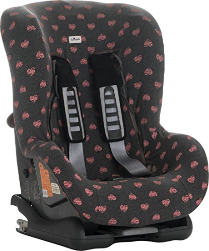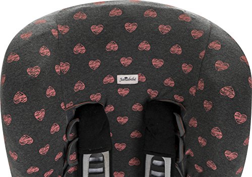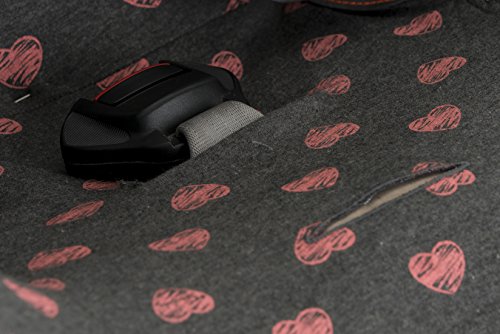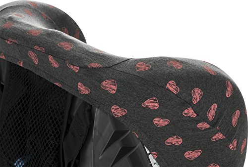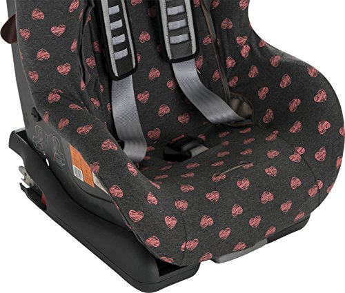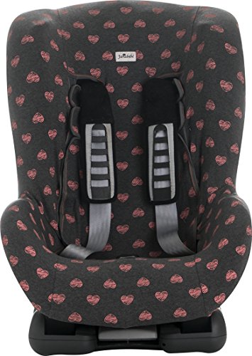 Dark grey fabric with dark gray with pink hearts fluor pattern. Fits infant carriers / car seats Group 1+ for example: Maxi Cosi, Romer, Cibex, Jané, Peg Perego, Chicco, etc. Fits over the existing synthetic cover of the chair.