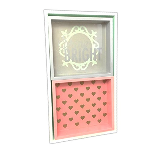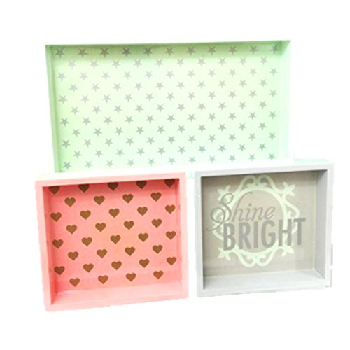 -. Feature : 2 smaller trays nest inside a large tray / Larger tray is 16 x 9 x 2" / Smaller trays are 7.5 x 8 x approximately 2" / Gray, mint green, and salmon pink tones / Composite wood with laquer paint
