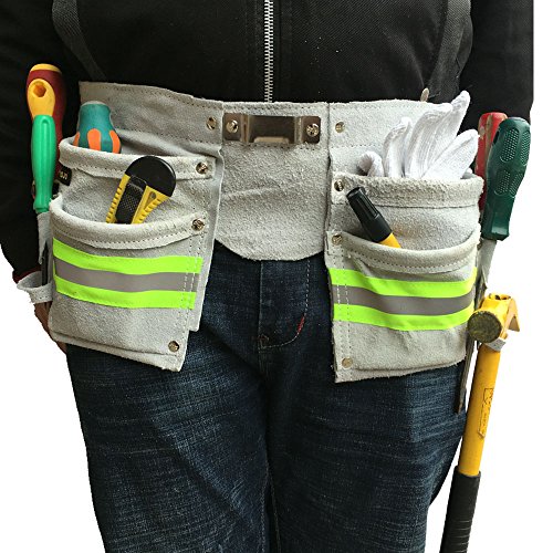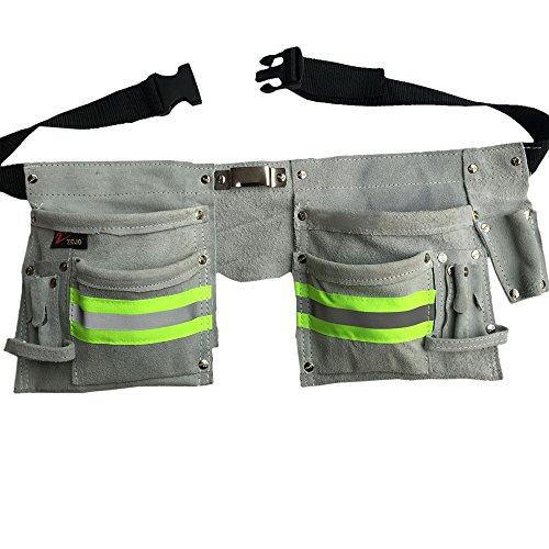 Reflective Genuine Leather Tool Bag for Roofers Maintenance Workers Construction Workers Plumbers Made With Cow Spilt Leather Adjustable Heavy Duty Tool Belt Fits the Waist to 44 inch(1 PACK, Grey)