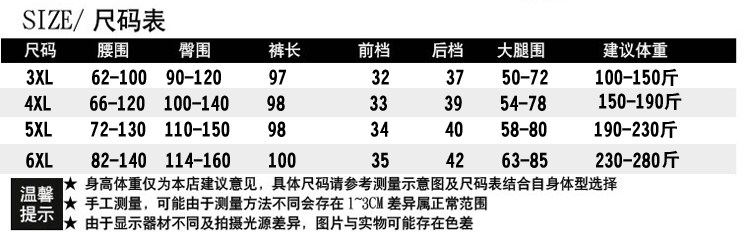 • 尺寸: 3XL【建议130-150斤】 4XL【建议150-190斤】 5XL【建议190-230斤】 6XL【建议230-280斤】