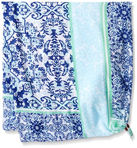 This is a beautiful printed scarf with knotted fringe details around the four corners. This is the perfect accessory for those chillier spring days when you are enjoying a walk at the park.