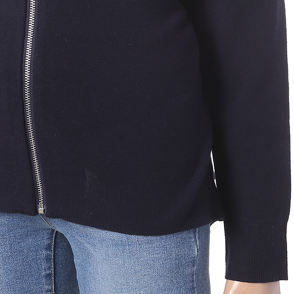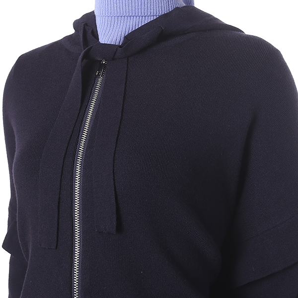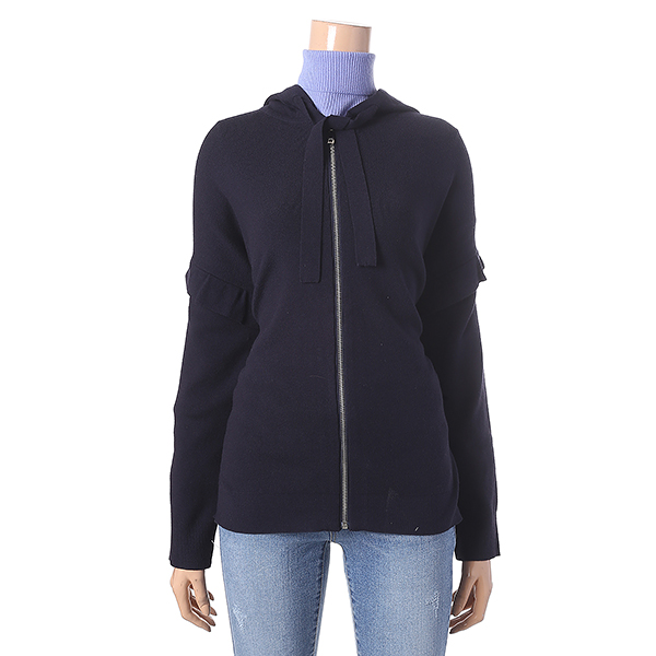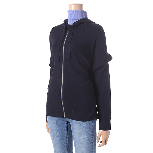 네이비 색상의 프릴 장식으로 귀여운 느낌을 주는 후드 집업 스웨터 입니다. 루즈한 핏 라인으로 편안하고 스타일리시한 연출이 가능합니다.