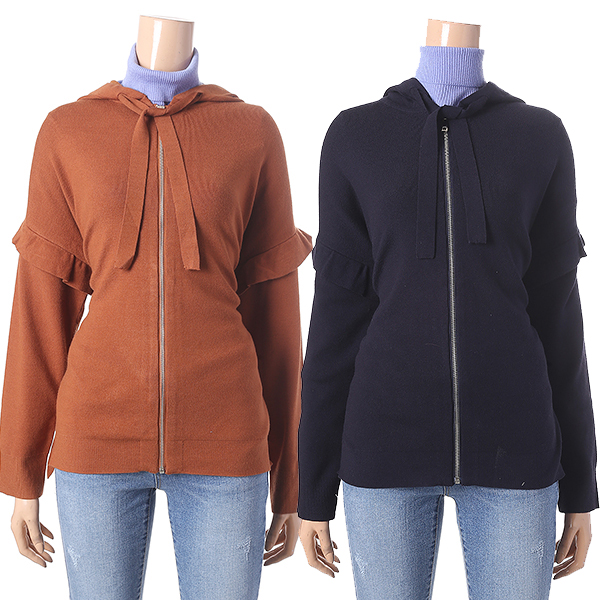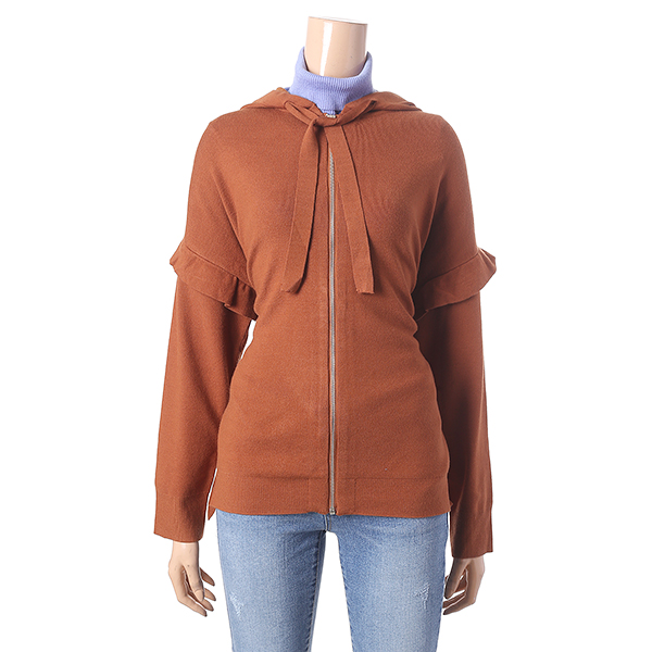카멜 색상의 프릴 장식으로 귀여운 느낌을 주는 후드 집업 스웨터 입니다. 루즈한 핏 라인으로 편안하고 스타일리시한 연출이 가능합니다.일론 소재와 폴리에스터 소재가 함유된 레이온 혼방 소재로 부드러운 촉감과 뛰어난 보온성을 느낄 수 있습니다. 팬츠와 함께 멋스러운 데일리룩을 즐길 수 있습니다.