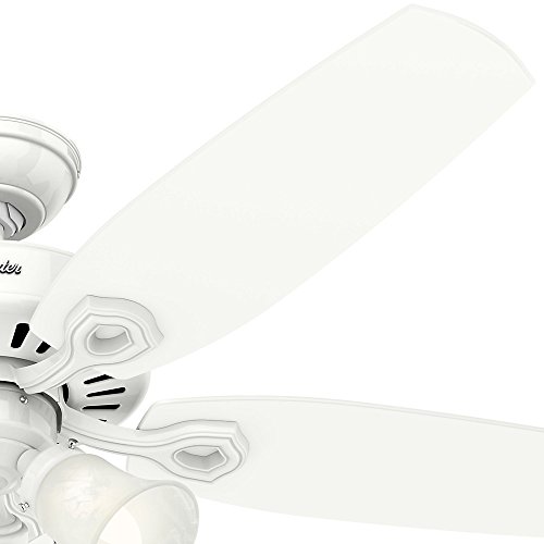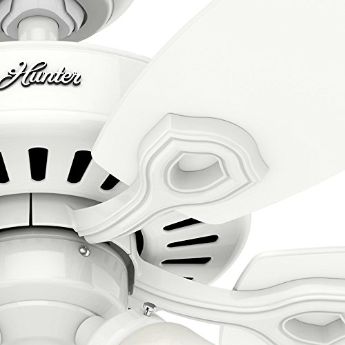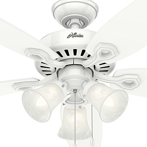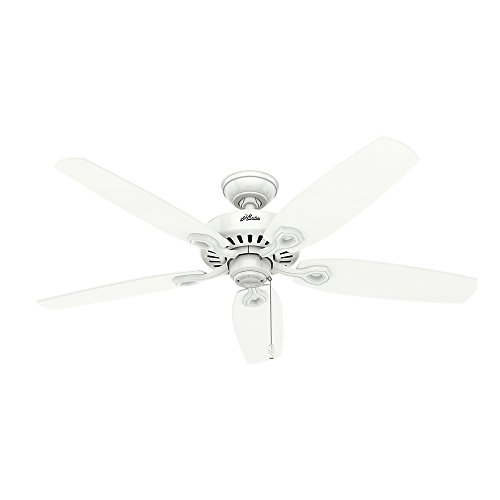 When you've arrived at that place where you're simply unwilling to settle for anything less than the very best, you're ready for Hunter's Builder Plus. Builder Plus ceiling fans are more than just beautiful-they're painstakingly designed and carefully crafted. This is a fan you can count on for unmatched performance, a great price and easy installation. Uncluttered style in a snow white designer finish with five snow white blades blends seamlessly with your decor. The simple light fixture features a snowflake linen glass bowl and uses two 60W candelabra bulbs (included). High performance, Whisper Wind Motor delivers ultra-powerful air movement with whisper-quiet performance so you get the cooling power you want, without the noise you don't.Feature