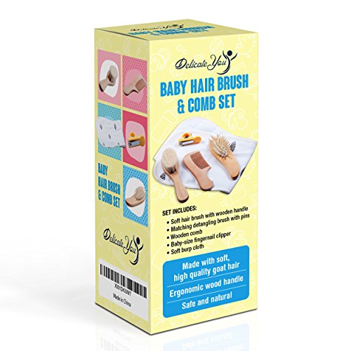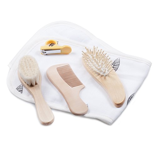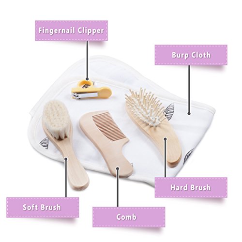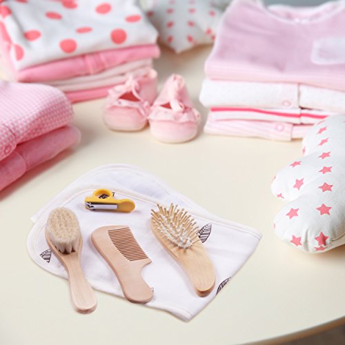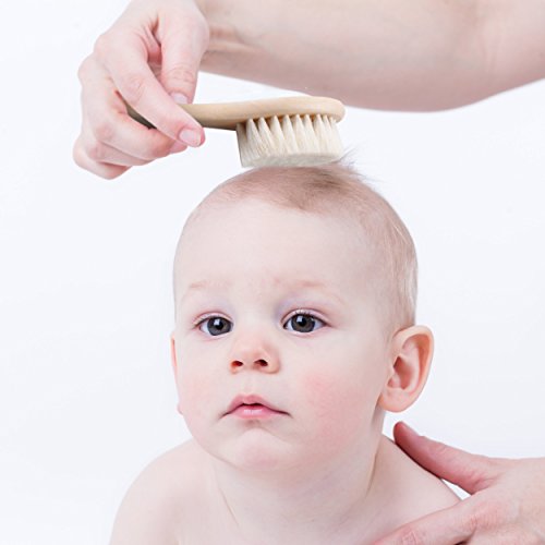 Baby Hair Brush and Comb Set - Soft Goat Hair to Reduce Cradle Cap - Includes Hair Brush - Pin Brush - Burp Cloth - Baby Nail Clipper - Wooden Comb -...