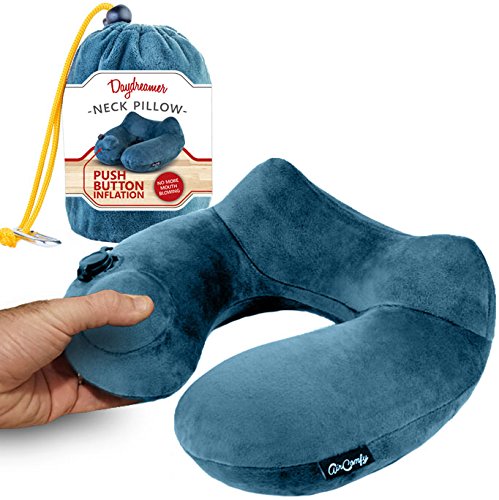 Daydreamer Inflatable Neck Pillow with Built-in Pump, Washable Cover and Compact Travel Packsack with Caribiner Clip to Attach to Airplane Luggage - Gray
