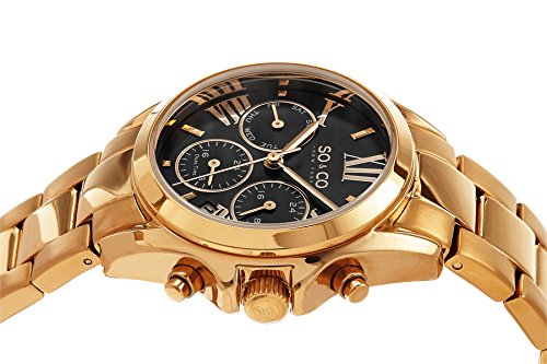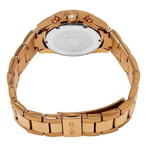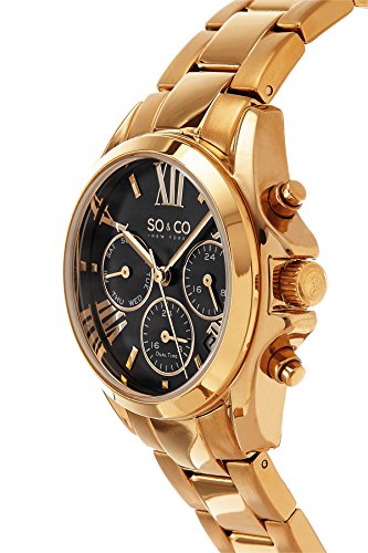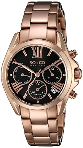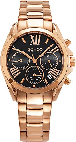 -. Binding : Watch -. Brand : SO&CO New York -. Color : Rose Tone -. Department : womens -. EAN : 0847988065559 -. Feature : Rose-tone round case with beveled bezel on a stainless steel triple-row link bracelet / Black dial with date window at 4:00 and three subdials for day, dual time, and 24-hour indicator / Quartz Movement / Case Diameter: 36mm / Water Resistant To 330 Feet -. Label : SO&CO MFG -. Manufacturer : SO&CO MFG -. Model : 5064.3 -. MPN : 5064.3 -. PackageQuantity : 1 -. PartNumber : 5064.3 -. ProductGroup : Watch -. ProductTypeName : WATCH -. Publisher : SO&CO MFG -. ReleaseDate : 2016-02-26 -. Size : Standard -. Studio : SO&CO MFG -. Title : SO&CO New York Women's 5064.3 Madison Quartz Day and Date World Time Rose-Tone Stainless Steel Link Bracelet Watch -. UPC : 847988065559 -. Warranty : Manufacturer Warranty