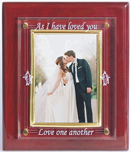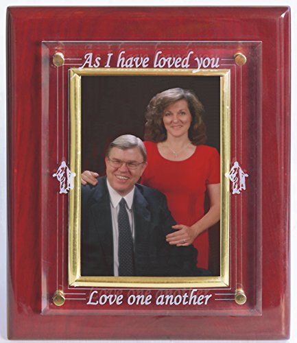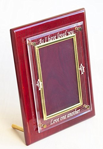 Luxury Christian Photo Frame for weddings, anniversaries, families, groups. A floating acrylic plate on a cherry piano finish plaque and 4 X 6 inch photo frame designed for wall desk or table display.