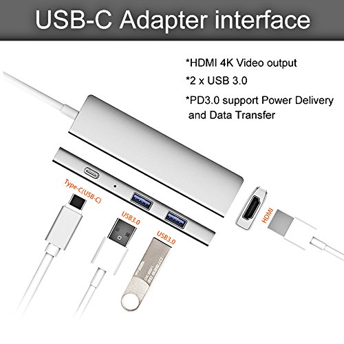 -. Feature : 1. Expand to multiple peripherals and transfer data while charging your Macbook and other Type-C devices. / 2. 2 x USB 3.0 high speed data transfer, PD 3.0 support Power Delivery. / 3. 4K Video Adapter:Mirror or extend your screen with USB C Hub C HDMI port and directly stream 4K UHD or Full HD 1080P Vedio to HDTV,Monitor or Projector. / 5. Plug and play-does not require any software, drivers or complicated installation process. / 6. Unibody aluminum alloy exterior, ionized finish reinforced TPE cable coating, and Mac-style LED activity indicator; EMI projection to prevent from interfering with wireless devices.