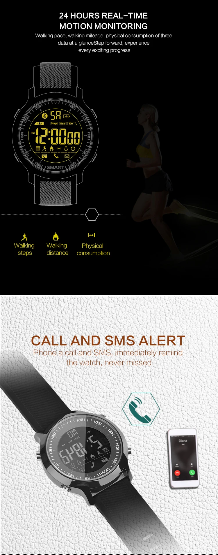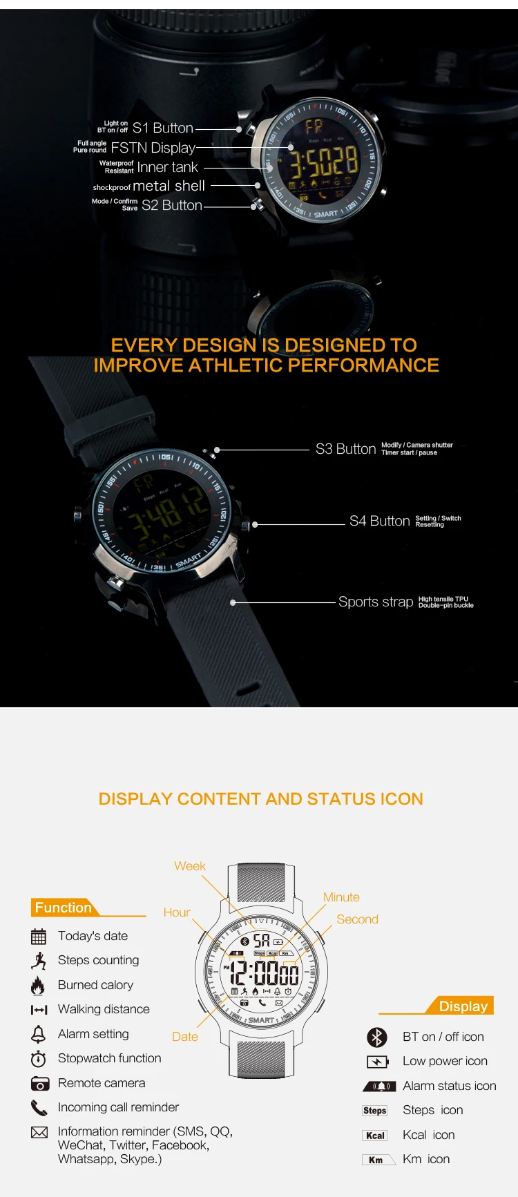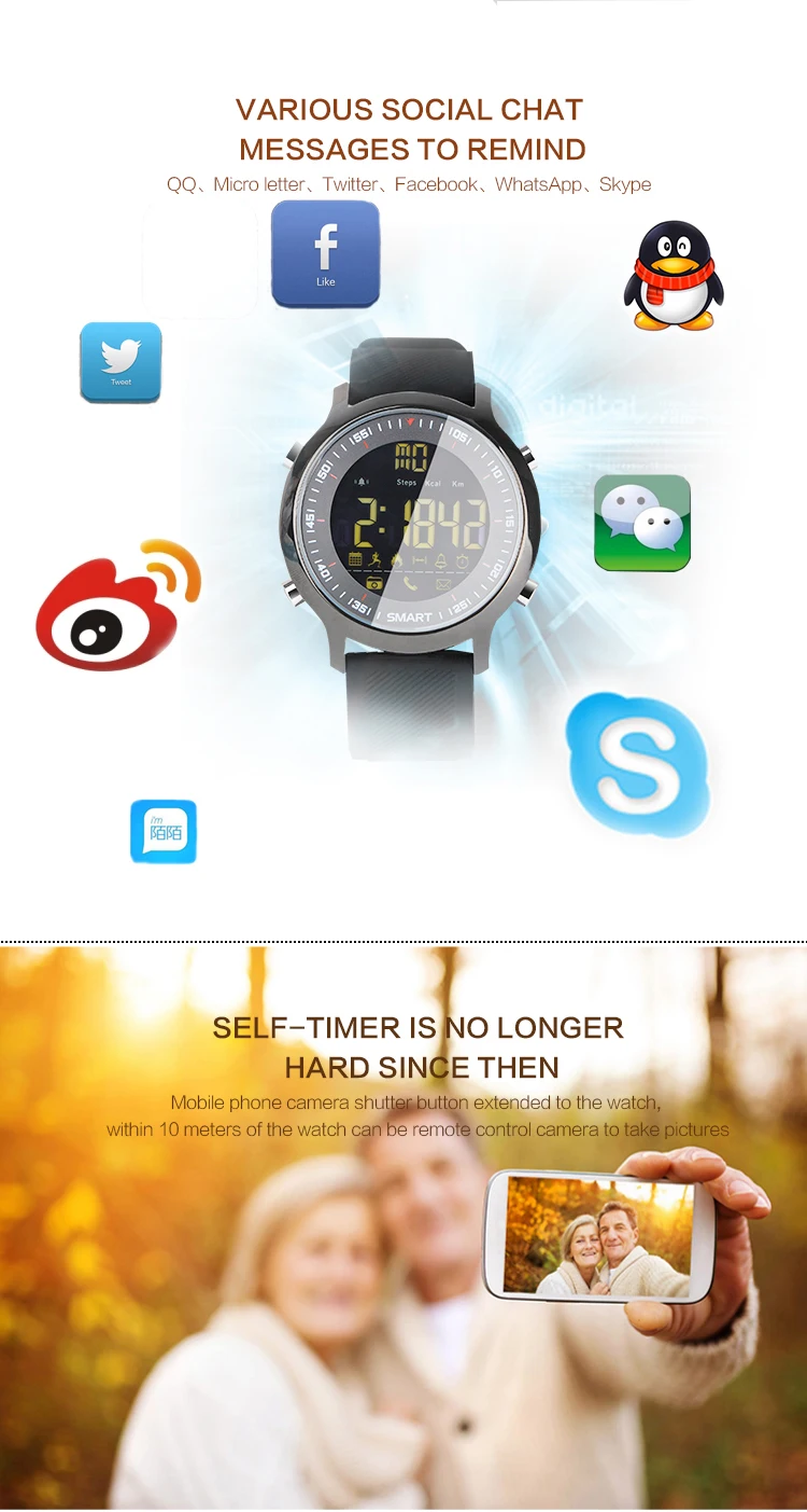 Function:Chronograph,Week,Remote Control,Noctilucent,Alarm Clock,Month,Passometer,Message Reminder,24 hour instruction,Call Reminder,Fitness Tracker