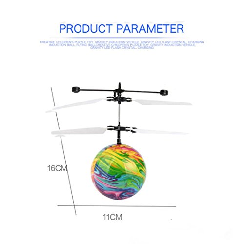 Products Features: Flying Ball Size: 16*5.5*11 (cm) Body Material: ABS Plastic. Suitable for: Ages 8 . charging method:USB Charging Battery: 3.7V 75MAH Lipo battery Charging Time: Approx. 20 minutes Use time: 8 to 10 minutes Sensing distancen:10 meters