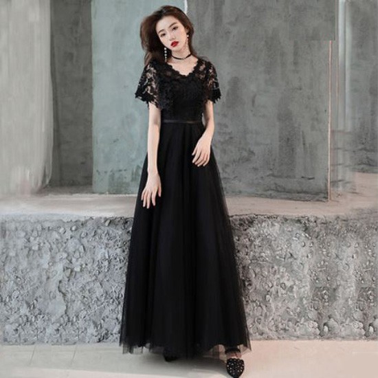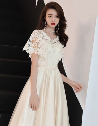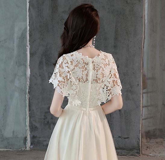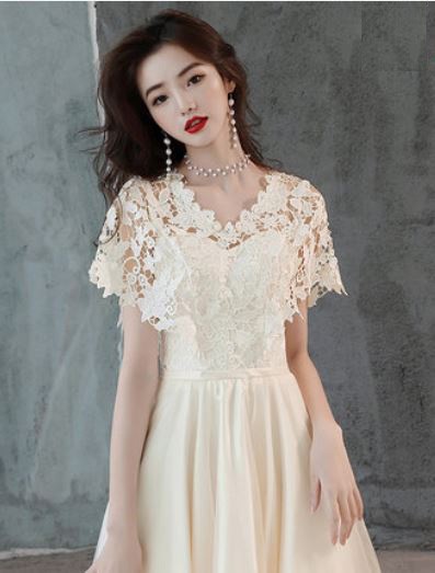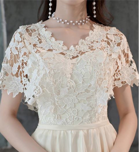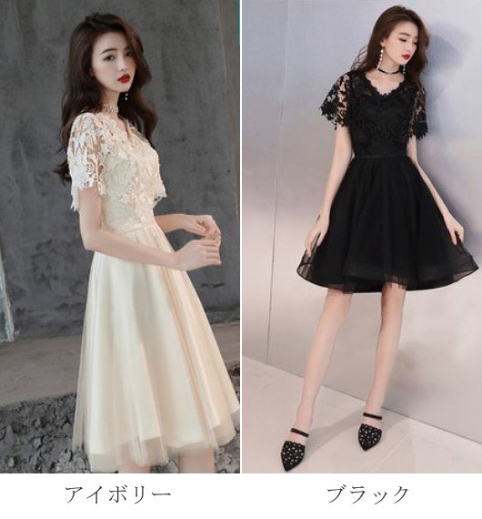 ケープ風レース袖が華やかなドレスです。