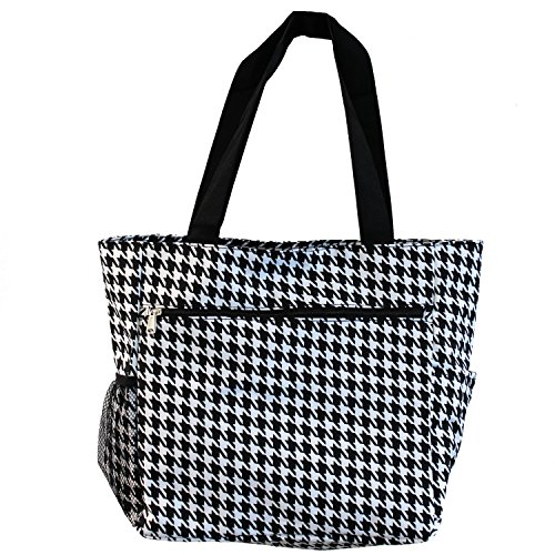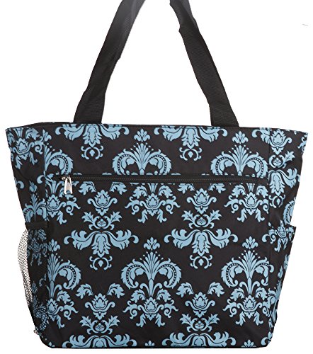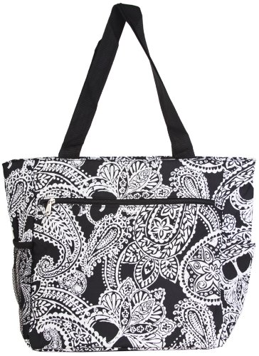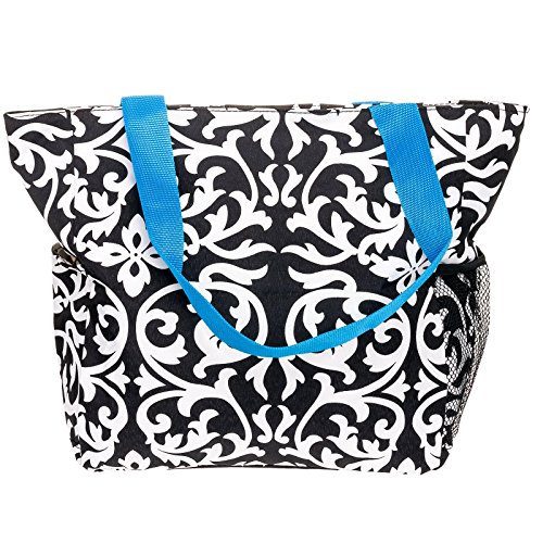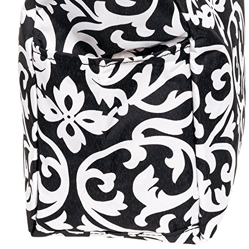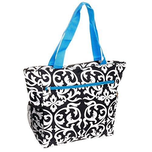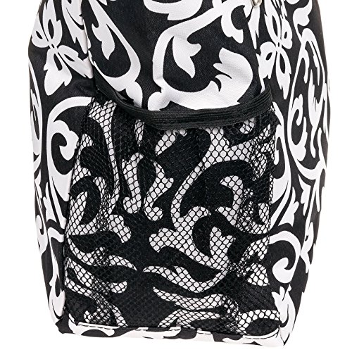 This Black & White Damask Beach Tote Bag from Silverhooks gives you the most bang for your buck. A durable lined interior and polyester exterior allow you to easily spot clean most spills or markings while providing you with a tough bag that won't easily tear or puncture. Great for a day at the beach, out shopping, or just going out with friends, this bag won't get old and you'll never run out of activities that this bag can be used for. A large zippered main compartment, 2 exterior slip pockets, and a back zippered pocket can store your towels, groceries, cell phone, keys, wallet, and much more. Featuring a unique pattern and color combination, this reusable shopping bag is only available from Silverhooks. Measures 18.5" x 13.75" x 6.5".