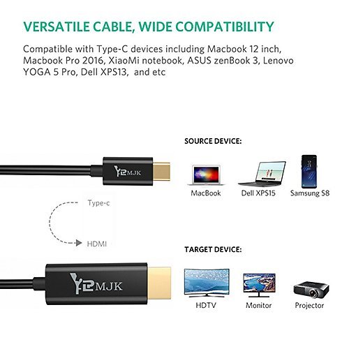 No Adapter, No Converter YRMJK USB C to HDMI Cable lets you use the USB-C port on your computer to directly deliver visuals on your HDMI-equipped monitor/HDTV/projector without the need for cumbersome adapters. Resolutions up to 4K 60Hz Support resolutions up to 4K with a refresh rate of up to 60Hz for a clear picture that reduces blurring during fast-action scenes. Plug and Play Plug and play design, no external power and driver required with this cable. Supports bus-powered and self-powered operation. OS Compatibility Compatible with Windows OS XP/Vista/7/8/10 (X86/X64), Mac OS 10~10.12.1. USB Type C Compatible Devices: - 2017 MacBook Pro - 2016 MacBook Pro - 2015/2016 MacBook - ChromeBook Pixel - Dell XPS 13-9350-R1609 13.3", XPS 15 - Acer V15 Nitro - Asus GA-Z170X - HP EliteBook Folio G1 - Asus ZenBook UX390UAK - Lenovo Yoga 910 - HuaWei MateBook - Samsung Notebook 9 900X5L-K01 - Samsung Galaxy S8 or S8 Plus - LG 34" Class UltraWide Gaming Monitor etc. Important Notes: 1.It works for Thunderbolt 3 compatible Type-C port only. 2.It is only compatible with computers with DP alt mode, not for USB-C smartphones and tablets, as most of them work with MHL or SlimPort solution. 3.It needs 8-10 seconds for the signal to synchronize from computer with your monitor. 4.DO NOT used with another adapter 5.4K resolution requires a 4K equipped source, and 4K display. For instance, if your computer supports 4K 60Hz, while your monitor/TV only supports 4K 30Hz or 1080p, you can only output 4K 30Hz or 1080p rather than 4K 60Hz. MacBook 12" Adoes not support 4K 60Hz output; it has a maximum output of 4K 30Hz. 6.Make sure your Notebook is Thunderbolt 3 USB 3.1 compatible or this wont work for you 0 |