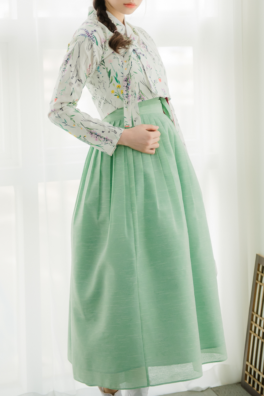 은은한 꽃무늬까지 자수처럼 놓여져있는 고급 한복지의 허리치마 입니다.