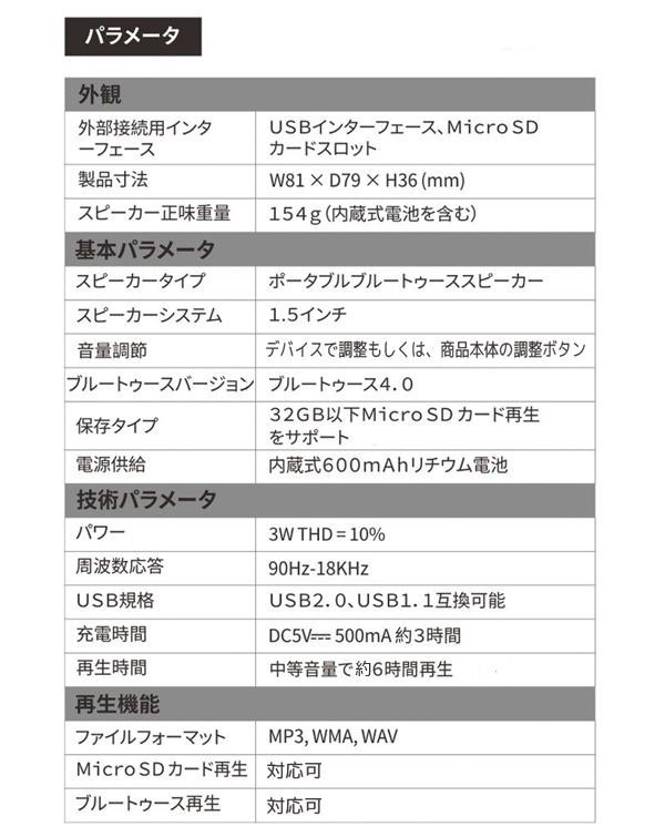| Bluetooth(ブルートゥース)で簡単にスマホやタブレットと接続ができるポータブルスピーカーです。3Wシングルスピーカーで大音量、高音質を実現しました。ハイクオリティな音質で大音量でも音割れすることがありません。またmicroSDカードやUSBでの有線接続ができますので、スマートフォンだけでなく様々な音楽プレイヤーやゲーム機、DVDプレイヤーなどに接続できます。接続機種を選びませんので、色々な人にお使いいただけます。 |