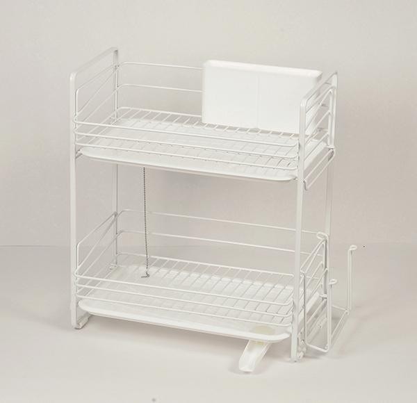 まな板受け、水切りポケットの付いたスリムな2段タイプ。防サビ加工でいつまでもキレイ!下段用トレーを回転させれば、左右どちらのシンク位置でも排水可能です。 |
