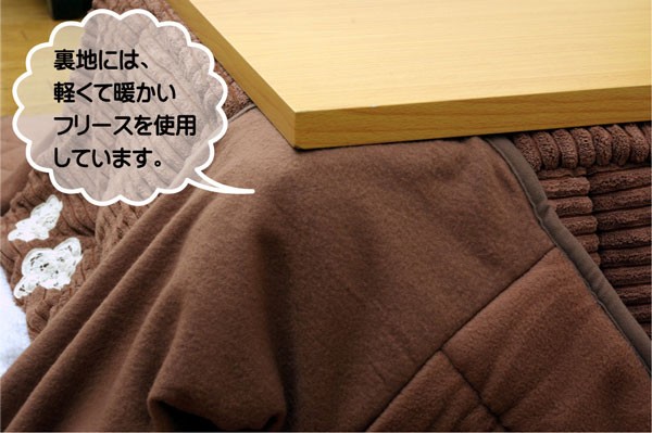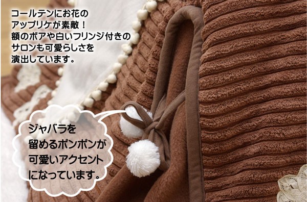 かわいらしい花柄のワンポイント刺繍を施した省スペースタイプのこたつ布団です。4隅を結んで頂く事で、お部屋のスペースを広く使用していただけます。しっとりやわらかなサンゴマイヤー素材をおしゃれなコールテン調に仕上げています。裏地にはあったかフリース素材を使用しています。お得なサロン付のこたつ掛敷セットです。部分暖房のこたつ布団は電気代もお得です。