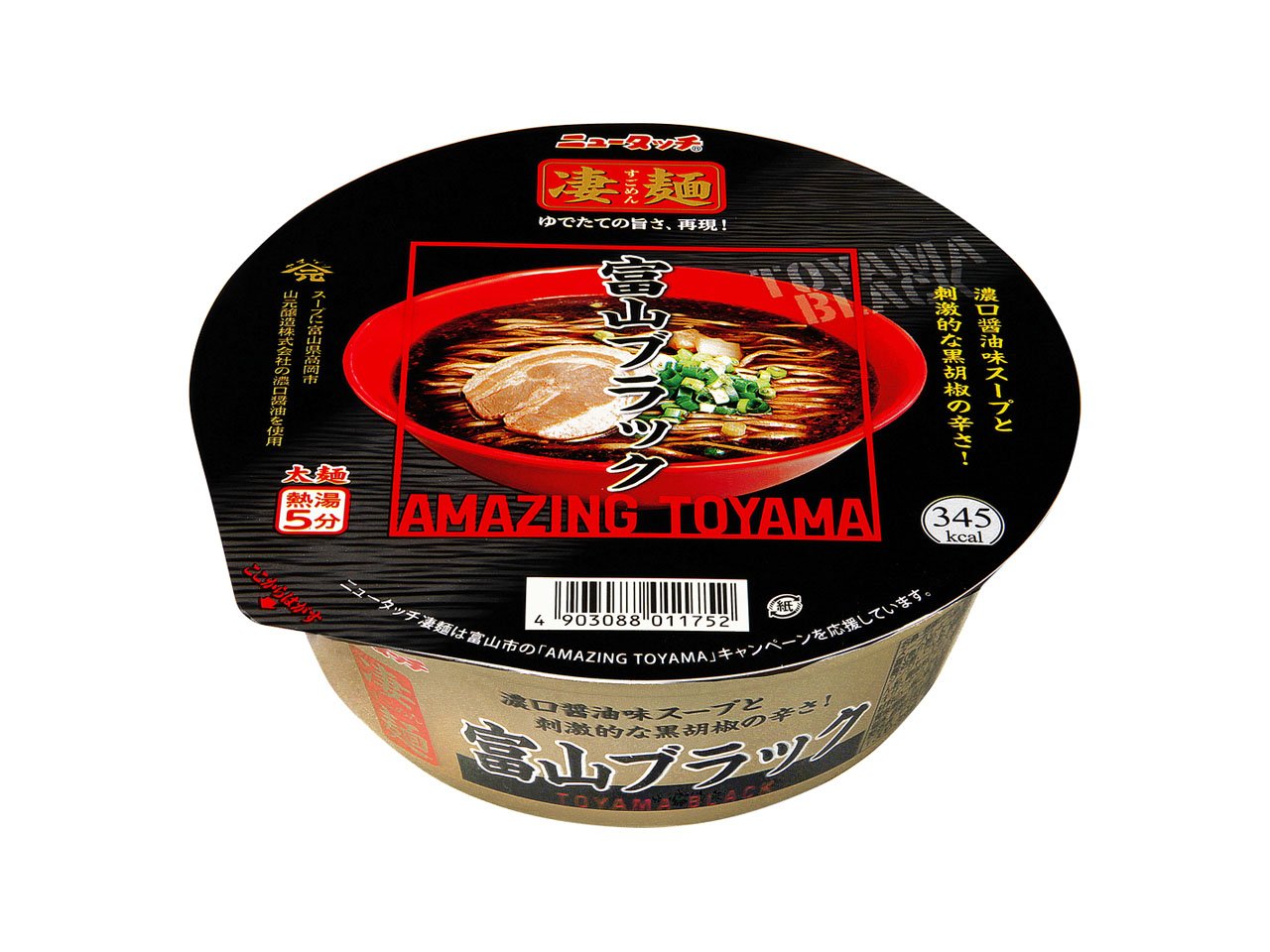 Popular local ramen in Toyama prefecture characterized by black soup was reproduced with cup noodles.