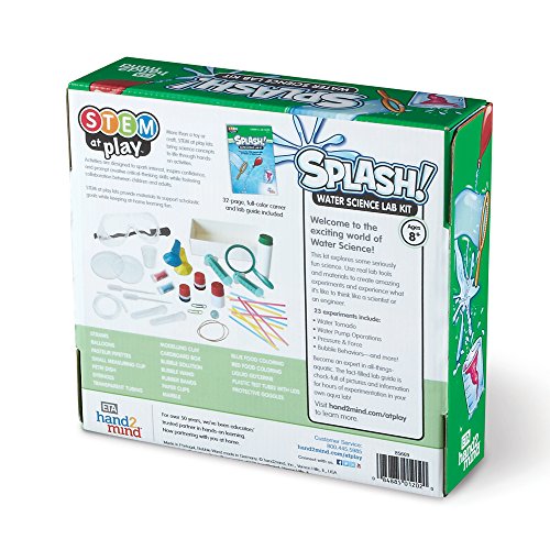 -. Binding : Toy -. Brand : ETA hand2mind -. EAN : 0793631366460 -. Feature : Discover the excitement of Science, Technology, Engineering and Math with 23 Hands-on Experiments. / STEM at Play kits bring science concepts to life through hands-on activities. / Explore the many properties of water and experiment with color and bubbles. / The fact-filled colorful lab guide is chock-full of pictures and information for hours of fun in your own watery lab! / Please note: You may need additional household materials for these experiments. -. IsAdultProduct : 0 -. ItemPartNumber : 85669 -. Label : ETA hand2mind -. Manufacturer : ETA hand2mind -. Model : 85669 -. MPN : 85669 -. PackageQuantity : 1 -. PartNumber : 85669 -. ProductGroup : BISS Basic -. ProductTypeName : TOYS_AND_GAMES -. Publisher : ETA hand2mind -. Studio : ETA hand2mind -. Title : SPLASH! Water Science Kit with 23 Experiments (Ages 8+) -. UPC : 084885012020 -. Warranty : Standard manufacturer warranty applies
