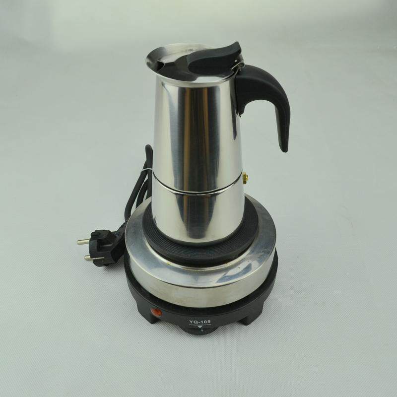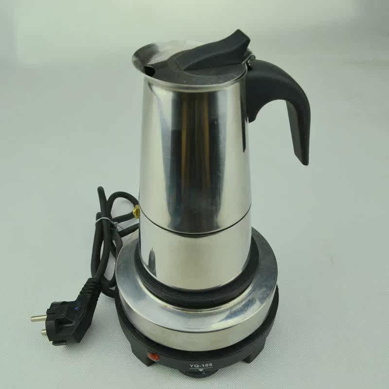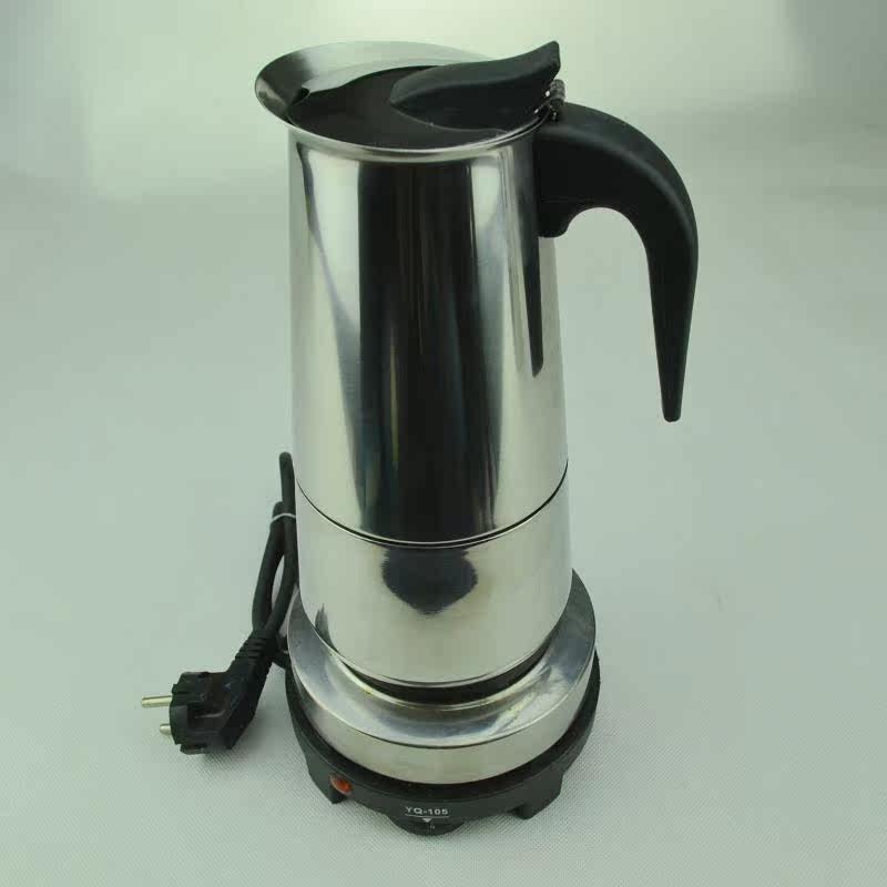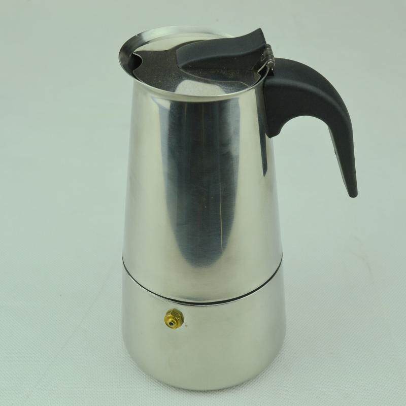 This coffee maker is stainless steel with a plastic handle which fits in the hand comfortably.