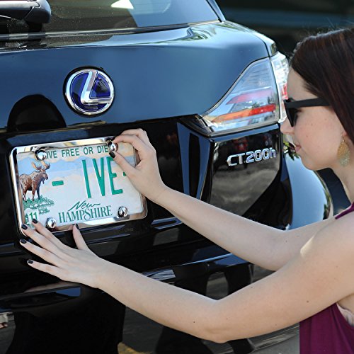 - Feature : High-Grade Stainless Steel. Not chrome plastic. / They are heftier in weight and intended for those in areas where salt is used on roads. Stainless steel is a more expensive material and is used where both the properties of steel and corrosion resistance are required. Will not readily oxidize or pit. That said, if treated or stored incorrectly, any grade of stainless steel may discolor or stain. To maintain optimum appearance, the surface should be cleaned and flushed regularly. / These license plate screw caps are considered a robust deterrent to theft because once installed they don't come apart with ease. They can be removed with some finesse. However, means of removal will not likely be intuitive to someone on a dark street who is sizing up your license plate. Not intended for applications where periodic removal is anticipated. / Large enough in diameter for most license plate screws. They measure 3/4 in. dia. and will accommodate a screw head of 5/8 in. The fasteners supplied are 3/4 inch long number 12 self-threading screws and will be suitable for many vehicles, but not all. Pkg Includes set of 4 Screw Covers and SS Screws. / Order now with peace of mind due to our unrivalled warranty. No fine print. See below. And, for a limited time, SAVE 5% when you buy 2 sets and SAVE 10% when you buy 4 sets.