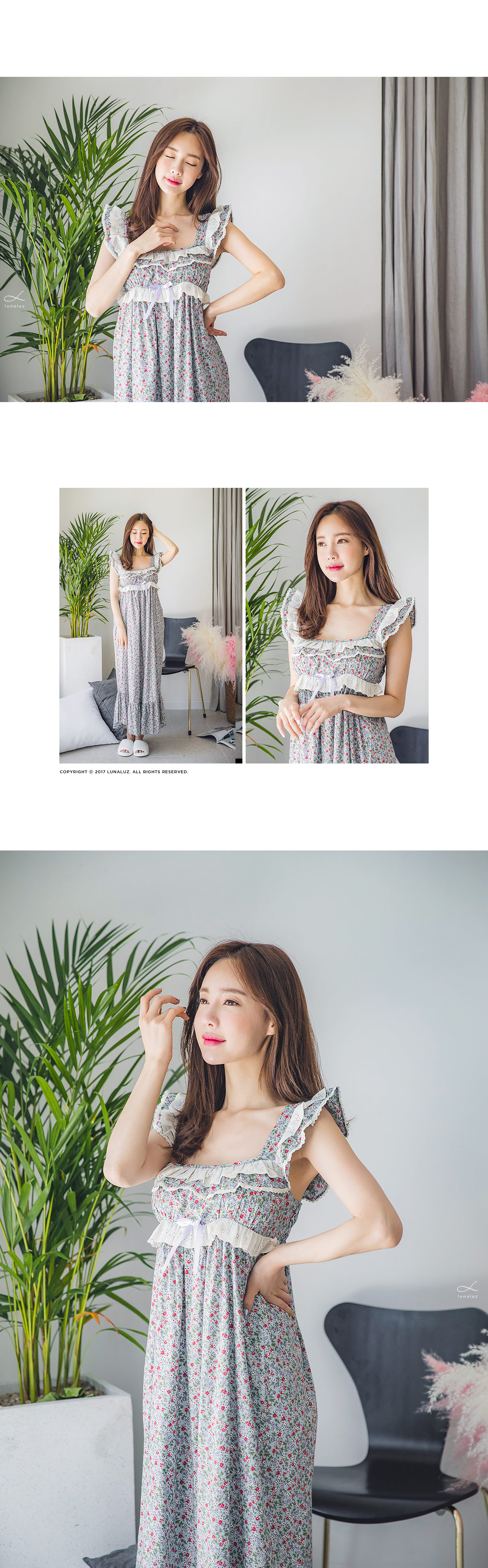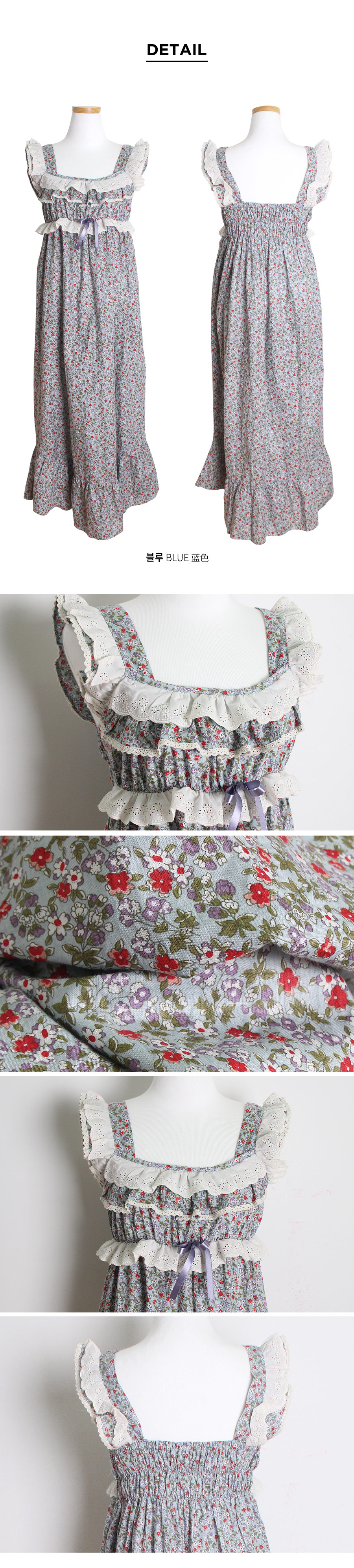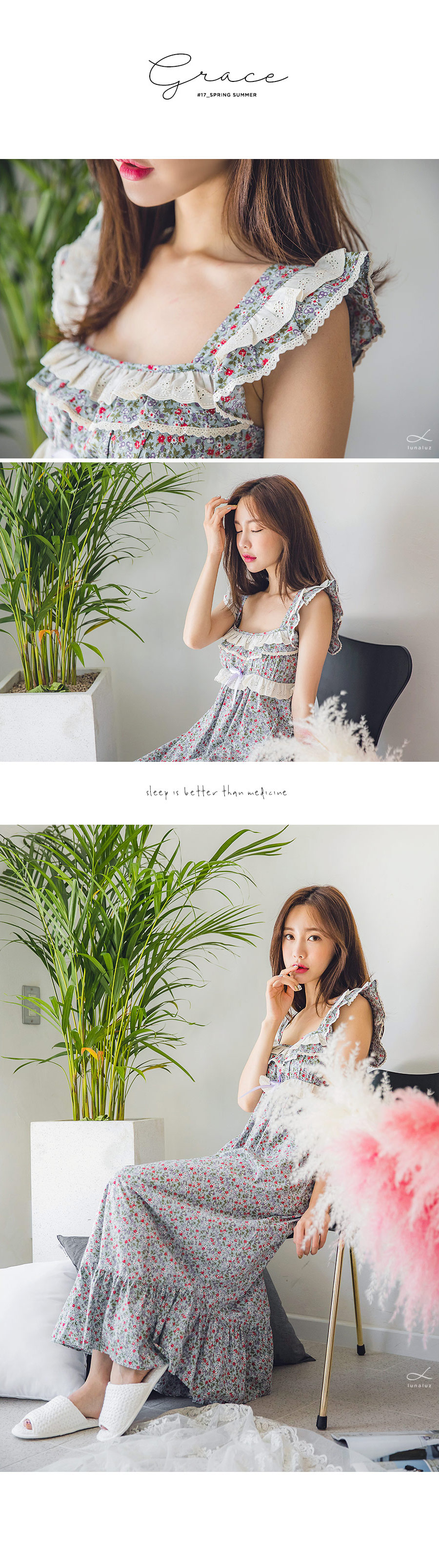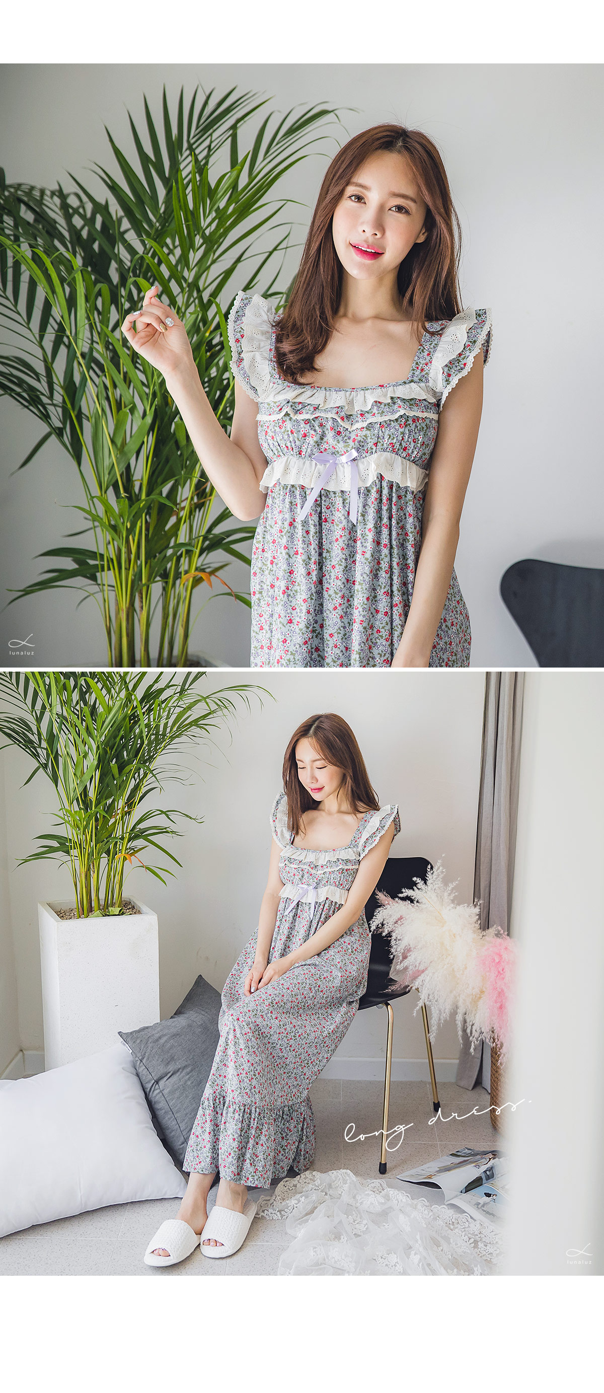 직접 보면 더 반하실 강력 추천 ‘그레이스 롱 드레스 잠옷’ 이에요 :_ 꾸준하게 판매율이 높은 그레이스 원단을 베이지 컬러의 고급스러운 레이스와 매칭하여 롱 드레스로 디자인해 보았는데요. 컬러감 자체가 블루 그레이로 굉장히 고급스러워서 고객님들이 분명 100% 만족해 하실 거에요. 터칭감이 부드럽고 매끈하게 떨어지는 느낌이 고급스러움을 더해줍니다. 네크 라인은 시원하면서 여리한 쇄골라인이 보일 수 있도록 스퀘어라인으로 파임을 주었으며 어깨 끈 부분부터 바스트 라인을 따라 프릴 장식과 잔잔한 레이스 장식을 달아주어 고급스러움을 더해주었습니다. 바스트 라인을 좀 더 풍성하게 잡아주는 패턴과 드레스의 뒷 부분에 3중으로 밴딩 처리를 해주어 안정감 있게 착용하실 수 있습니다. 포인트가 되어주는 잔잔한 플라워가 로맨틱한 분위기를 만들어 줍니다. 비침이 심하지 않아 여행지에서 특별하고 매력적이게 연출할 수 있는 롱드레스 홈웨어랍니다. 소장용으로도 선물용으로도 적극 추천해드리는 드레스 잠옷이에요 : ) 100% 국내 제작으로 퀄리티가 높고 부드러운 60수 아사면으로 얇아 봄 여름에 입기 좋습니다.