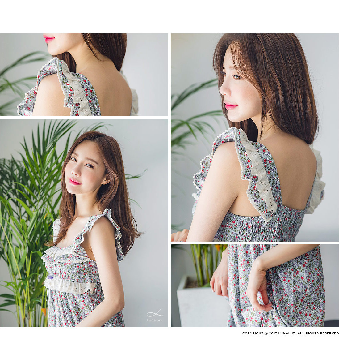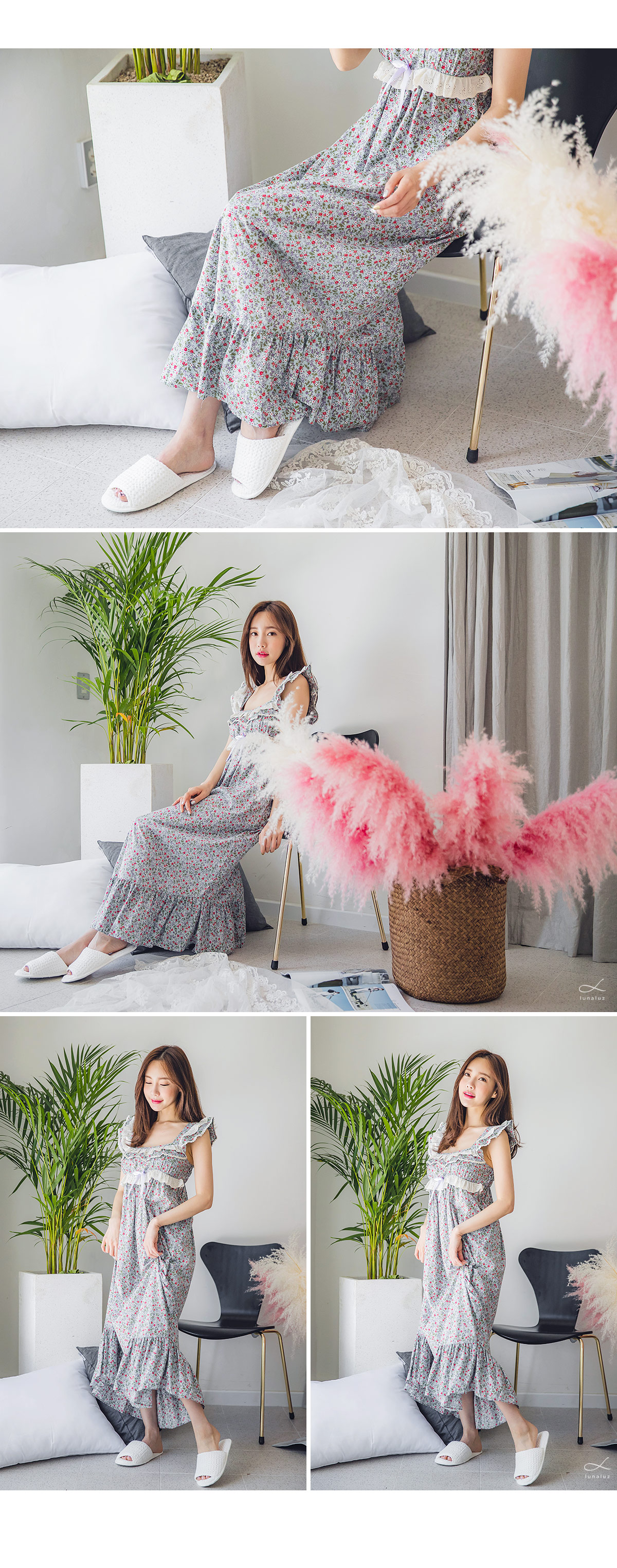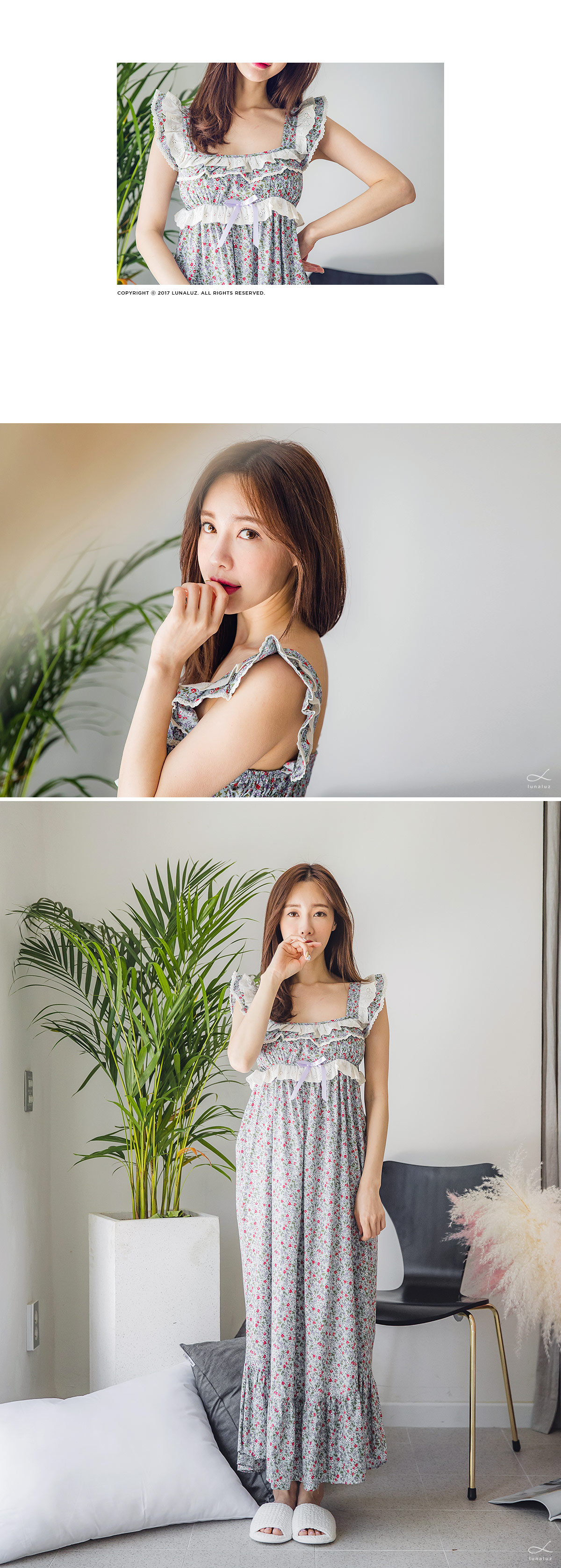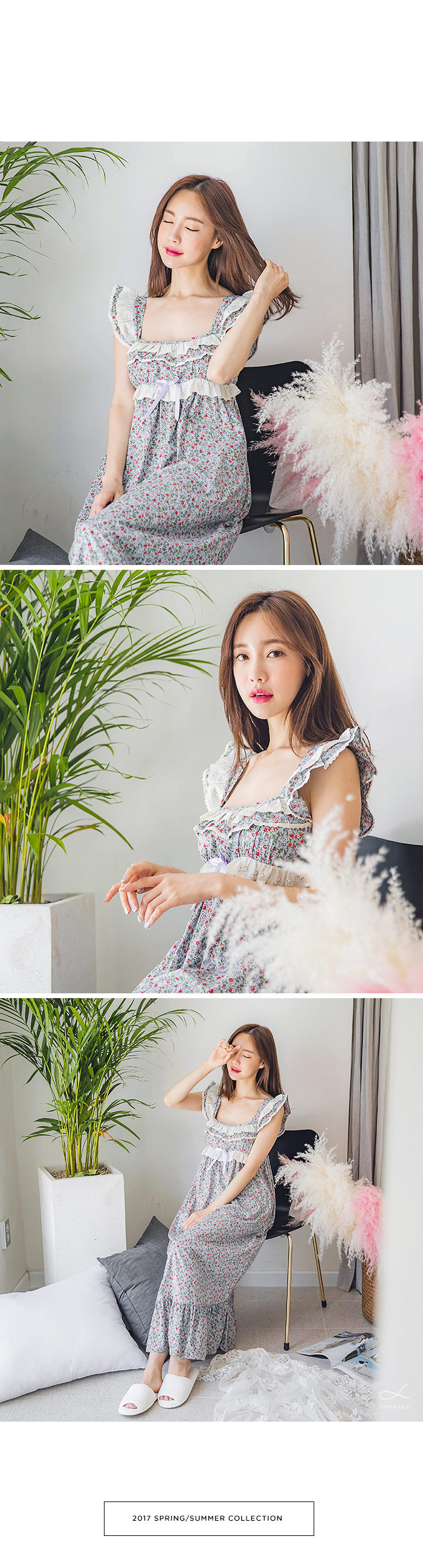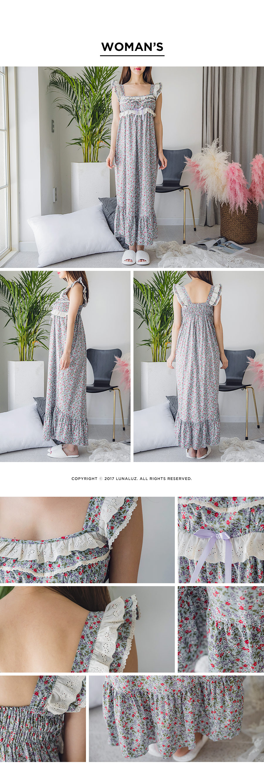 직접 보면 더 반하실 강력 추천 ‘그레이스 롱 드레스 잠옷’ 이에요 :_ 꾸준하게 판매율이 높은 그레이스 원단을 베이지 컬러의 고급스러운 레이스와 매칭하여 롱 드레스로 디자인해 보았는데요. 컬러감 자체가 블루 그레이로 굉장히 고급스러워서 고객님들이 분명 100% 만족해 하실 거에요. 터칭감이 부드럽고 매끈하게 떨어지는 느낌이 고급스러움을 더해줍니다. 네크 라인은 시원하면서 여리한 쇄골라인이 보일 수 있도록 스퀘어라인으로 파임을 주었으며 어깨 끈 부분부터 바스트 라인을 따라 프릴 장식과 잔잔한 레이스 장식을 달아주어 고급스러움을 더해주었습니다. 바스트 라인을 좀 더 풍성하게 잡아주는 패턴과 드레스의 뒷 부분에 3중으로 밴딩 처리를 해주어 안정감 있게 착용하실 수 있습니다. 포인트가 되어주는 잔잔한 플라워가 로맨틱한 분위기를 만들어 줍니다. 비침이 심하지 않아 여행지에서 특별하고 매력적이게 연출할 수 있는 롱드레스 홈웨어랍니다. 소장용으로도 선물용으로도 적극 추천해드리는 드레스 잠옷이에요 : ) 100% 국내 제작으로 퀄리티가 높고 부드러운 60수 아사면으로 얇아 봄 여름에 입기 좋습니다.