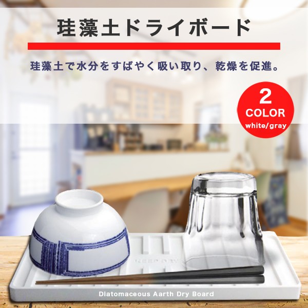 | 商品説明 | 全国送料無料! 箱は折りたたんでの配送となります。ご了承下さい。 水分をすばやく吸い取り、手入れも簡単な 珪藻土ドライボードです。 頻繁に使いたい食器の水滴もあっという間に吸い込み、自然に乾燥♪ 【珪藻土とは?】 珪藻土とは、太古の植物性プランクトン(珪藻)が、長年にわたり海定や湖底にちく推積して化石化した天然の鉱物です。 自然が育てた珪藻土は、天井や壁材などにも用いられ、自律的に吸湿、放湿を繰り返す「調湿」の機能を持っています。 「驚異の吸水力」の仕組みとしては、珪藻土の無数に開いた約0.001mm~0.003mmの小さな孔が物質的作用と科学的作用が相まって吸水性を生み出しています。 さらに珪藻土には、湿気を吸い取ると同時ににおいの分子も吸着する効果があります。 サイズ・容量 商品サイズ:約W25xH10xD1.3cm パッケージサイズ:約W30.5xH11.5xD3cm 重量:約370g 規格 ■生産地:中国 ■素材・成分:珪藻土 ■パッケージ:化粧箱入り(フック穴付き) 注意事項 カラー:グレー、ホワイト 【使用上の注意】 ・本来の目的以外での使用は控えてください。事故や破損の原因となります。 ・割れの原因となりますので使用しない時は乾燥させてから保管してください。 ・天然の鉱物を使用している為、自然色としての色味の不揃いや形状の相違、水分のカルキ等が表面に出てくる場合がありますが、自然に発生するものです。 ・珪藻土の特性上、微量の粉が出てきますが、品質上の問題はございません。 ・お子様が口に入れないよう十分ご注意ください。 ・水に浸さないでください。劣化の原因となります。 ・ロゴが入っている面を上にして硬さのある平らな場所でご使用ください。ボードに重いものを乗せたり、柔らかい場所やクッション性の高い場所で使用すると割れの原因になります。 ・吸水力が落ちた場合は紙やすりなどで表面を薄く削ると回復します。 |