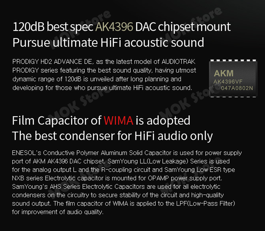 | D/A Converter (AK4396) | 1) Dynamic Range (S/N): 120dB A-Weighted (Typical) 2) Frequency Characteristic : 5Hz ~ 40KHz 3) Sampling Rate : 30KHz ~ 216KHz 4) Bit Resolution : 24Bit |